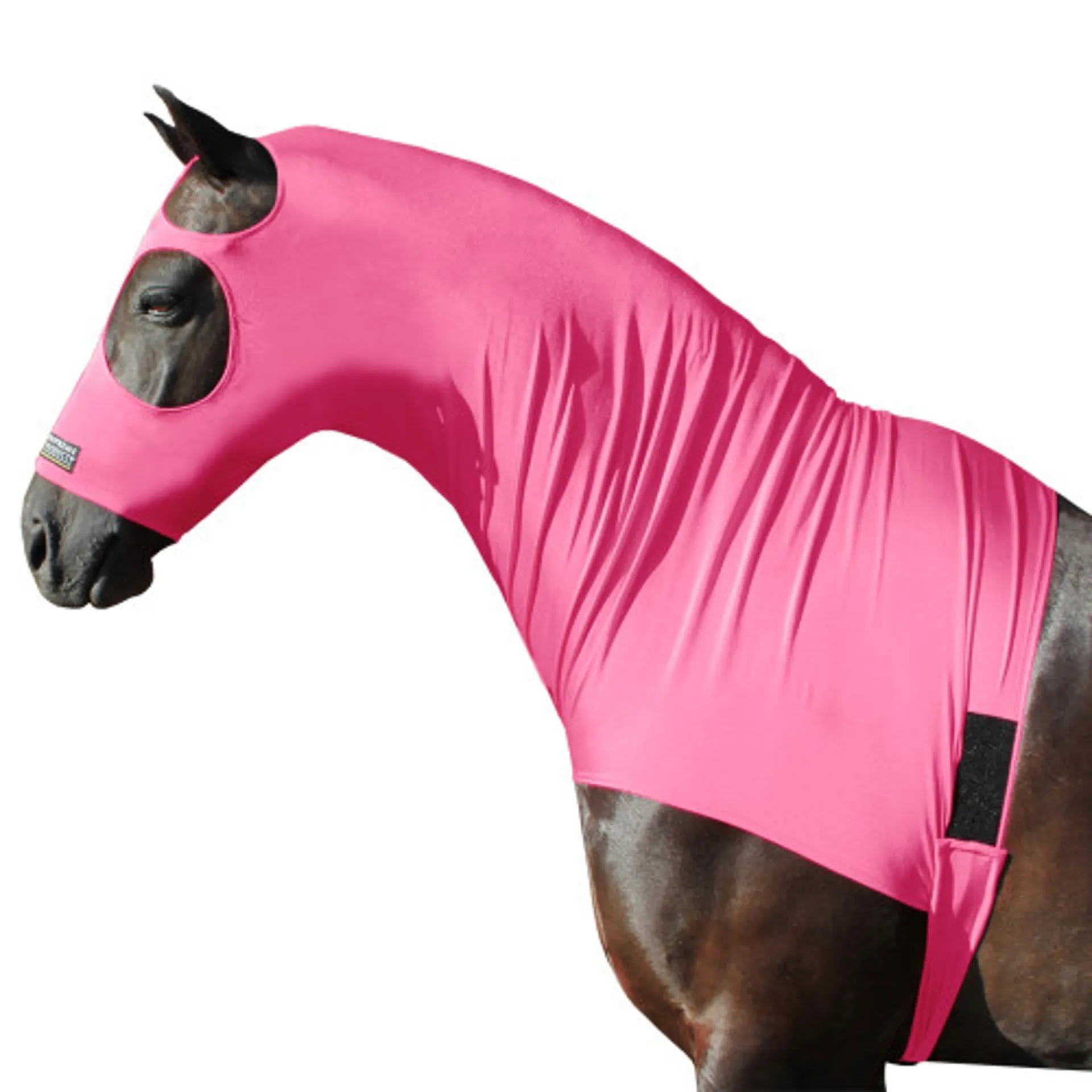 Supreme products hoods are designed with practicality and comfort in mind, to assist you in ensuring presentation of your horse or pony is at its best.Made of the highest quality 4 way stretch lycra mix, these hoods will fit snugly, stay in place and not pull back. Made with large eye holes and a comfortable easy-fit girth and elasticated strap through the front legs, once fitted and the horse or pony is upright, there should be some wrinkling in the neck. When the horse or pony drops his / her head, there is plenty of stretch in the fabric as well as the excess material in the neck